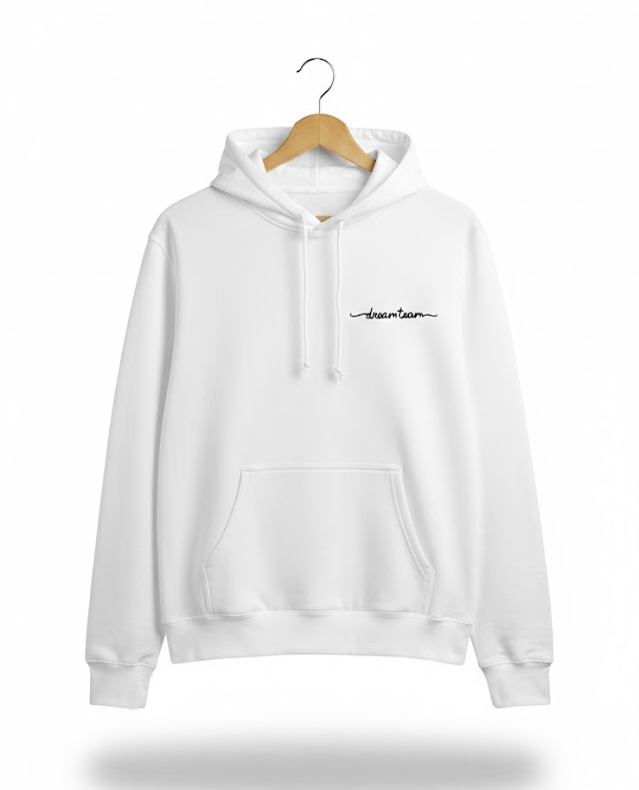 • Product: witte hoodie met zwart Dreamteam artwork op de borst
