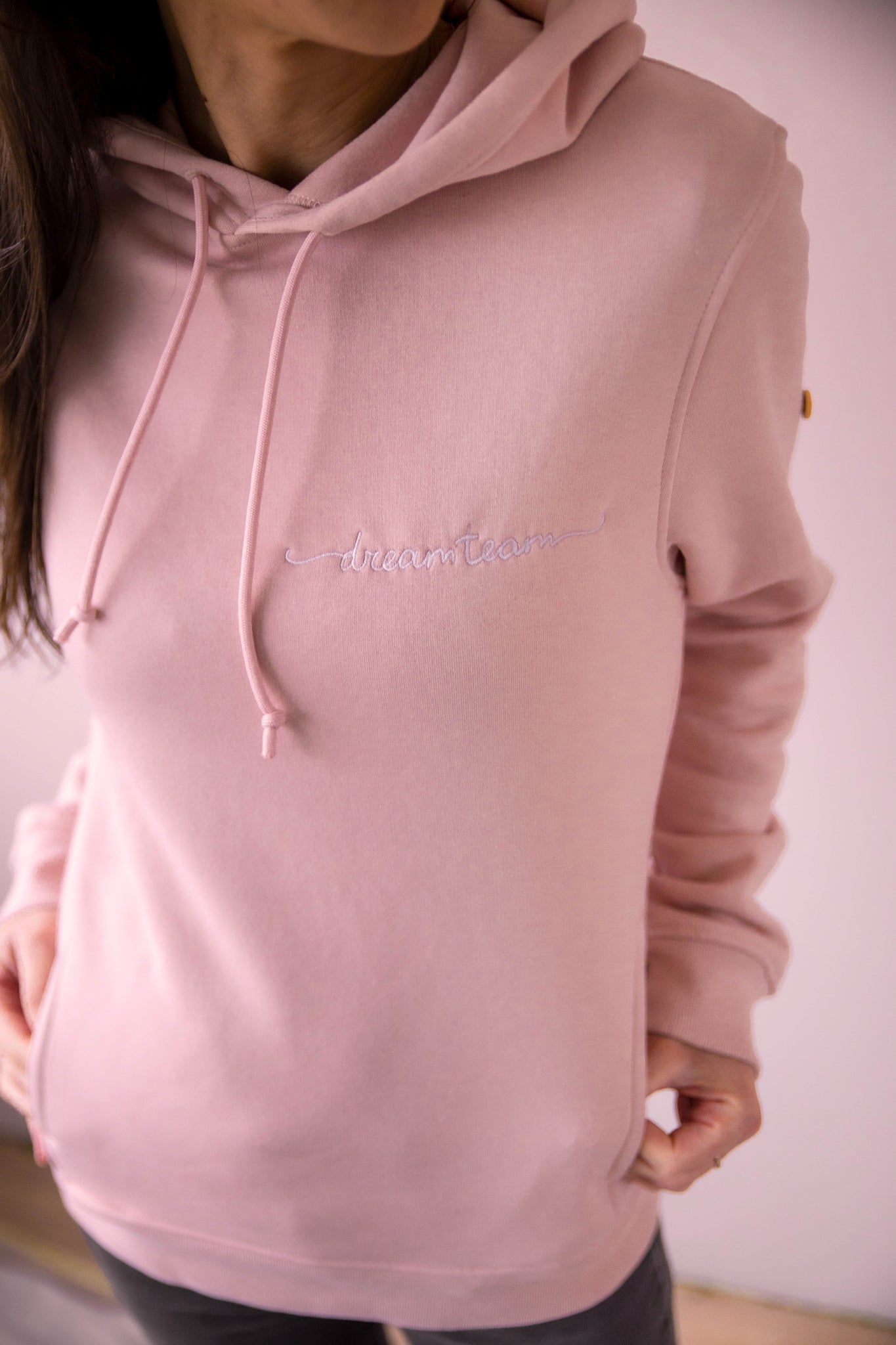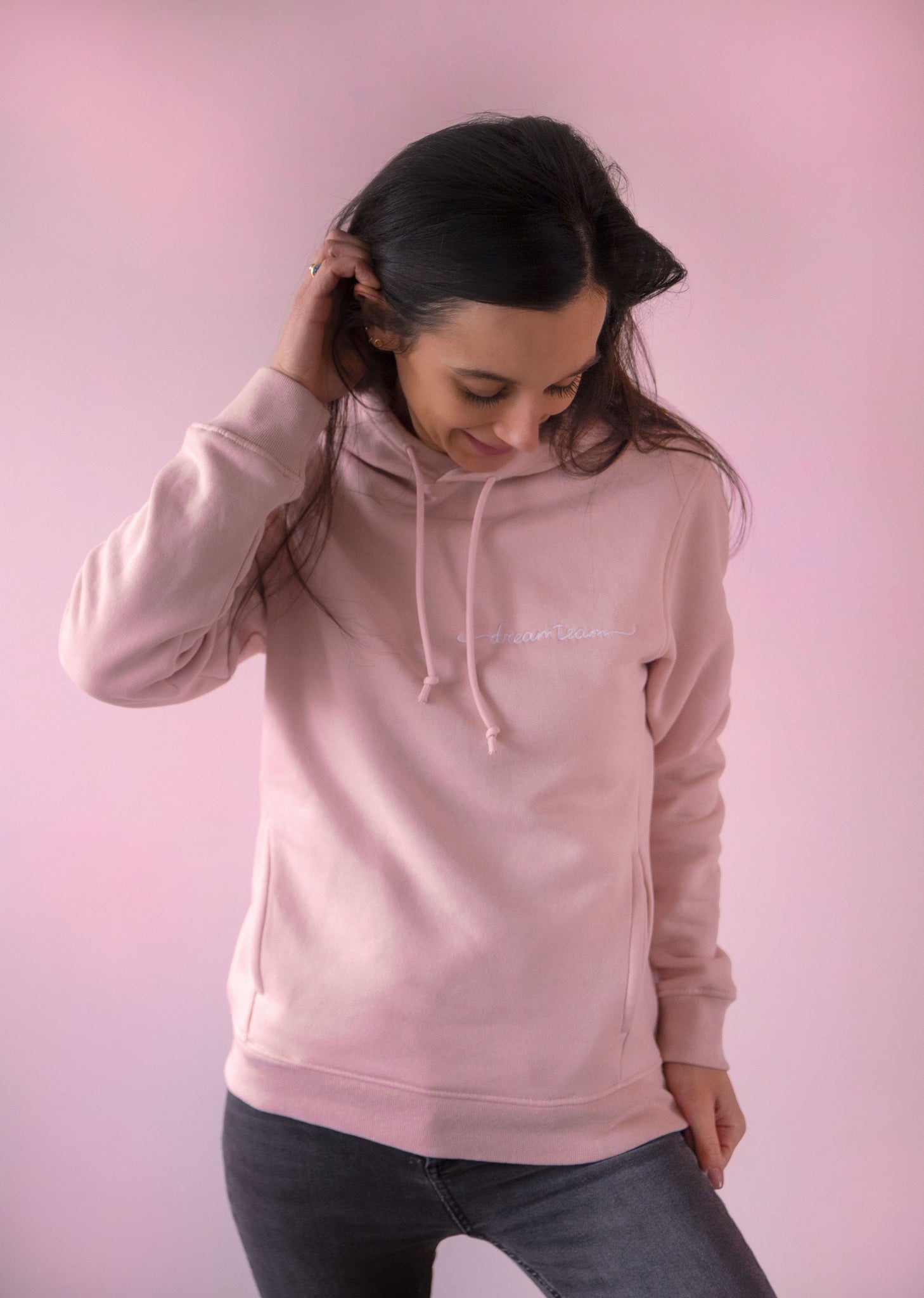 Imagine if you could be satisfied and content with your purchase. That can very much be your reality with the Dreamteam Hoodie - Dames - Pastelroze - Wit Artwork - Biologisch Katoen - Lilypilly.
